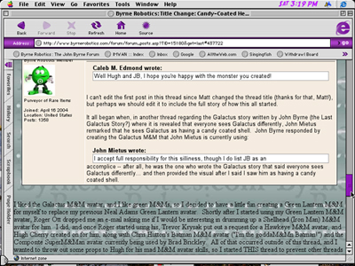 I liked the Galactus M&M avatar, and I like green M&Ms, so I decided to have a little fun creating a Green Lantern M&M for myself to replace my previous Neal Adams Green Lantern avatar. Shortly after I started using my Green Lantern M&M avatar, Roger Ott dropped me an e-mail asking me if I would be interesting in drumming up a Shellhead (Iron Man) M&M avatar for him. I did, and once Roger started using his, Trevor Krysak put out a request for a Hawkeye M&M avatar, and Hugh Cherry created on for him, along with Chris Hutton's Batman M&M avatar ("I'm the goddaM&Mn Batman!") and the Composite SuperM&Man avatar currently being used by Brad Brickley. All of that occurred outside of this thread, and I wanted to throw out some props to Hugh for his mad M&M avatar skills, so I started THIS thread to prevent other threads from being further highjacked.