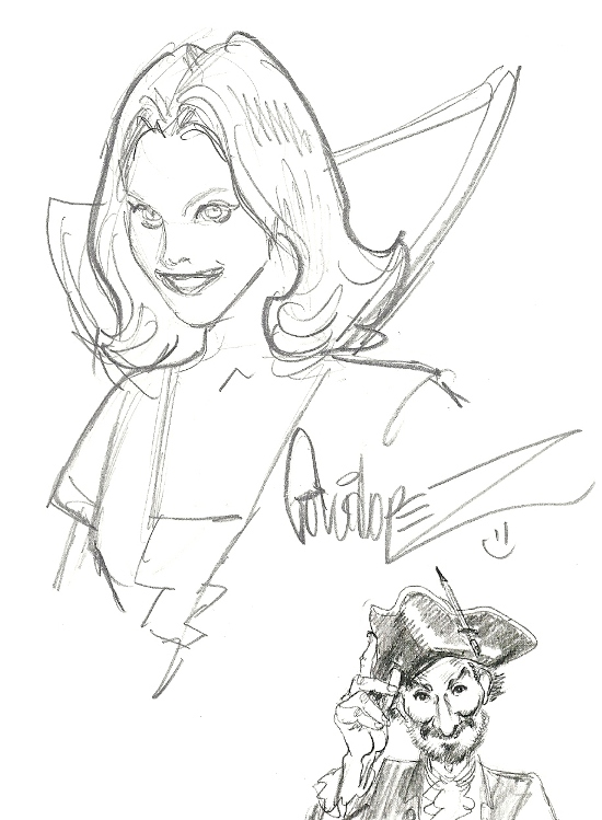 (He did sketches in a sketchbook he sold, in case you're wondering about the guy in the lower right. I really wanted a Captain America, or really any Marvel character would have done, but he said no, so I got as close as I could. :-) At least the sketchbook itself has a Spider-Man sketch in it.)