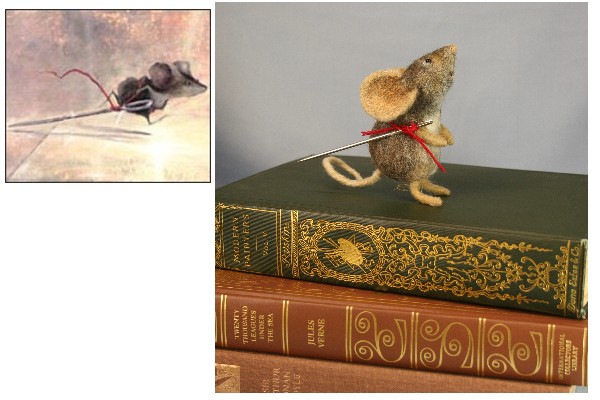 I just finished a mouse I did for a friend, it is from the book "Despereaux", it's not the movie mouse it's the book one. She is a 4th grade teacher and she LOVES the book and reads it to her kids each year. This one is something I just learned to do, it's called needle felting. Which is the process of taking a loose ball of wool and take a barbed needle and keep poking it over and over until it takes shape.I am pretty pumped it came out OK.