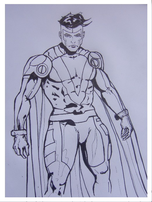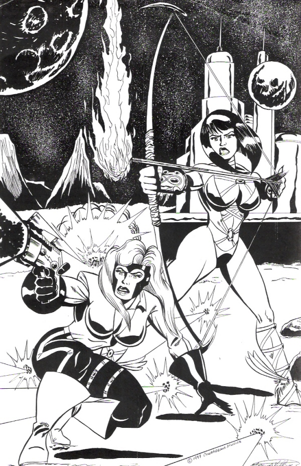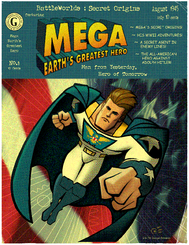 This is the cover to BattleWorlds: Secret Origins - Mega #1. Since he's a WWII era superhero, I designed the cover to reflect the comic book Golden Age, National Periodical Publications style, as an example of that era's design standards. I aged it and gave it an old school halftone printing process effect. This Golden Age tribute/homage was much fun to work on. GE