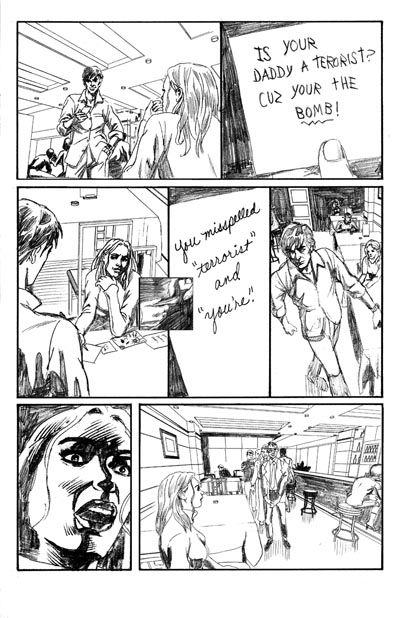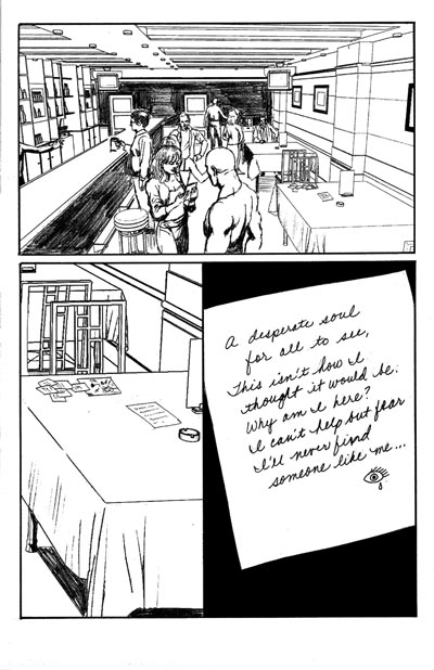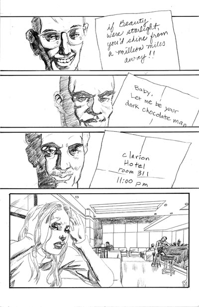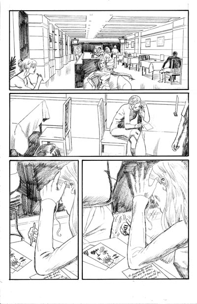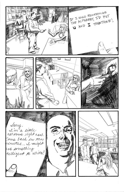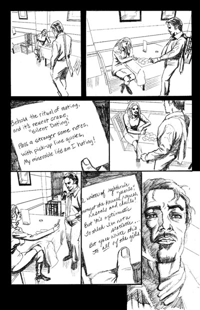 I recently finished a 10-page minicomic for the 2006 Isotope Excellence in Minicomics competition, which I wrote and penciled. There's no dialog (except for the writing on the notes, since it involves "silent dating"), so I forced myself to attempt to tell the story visually.