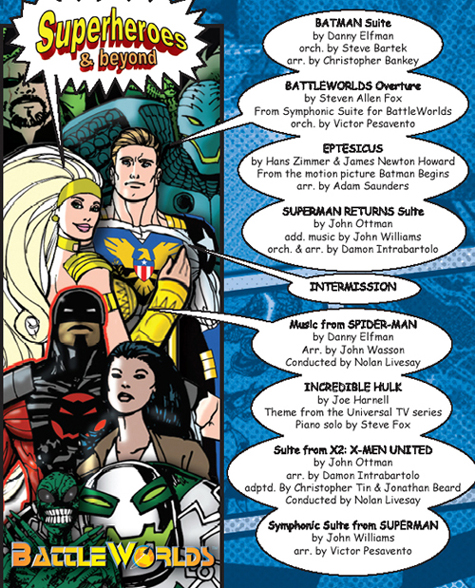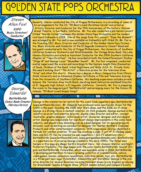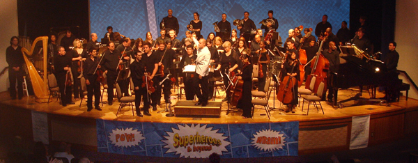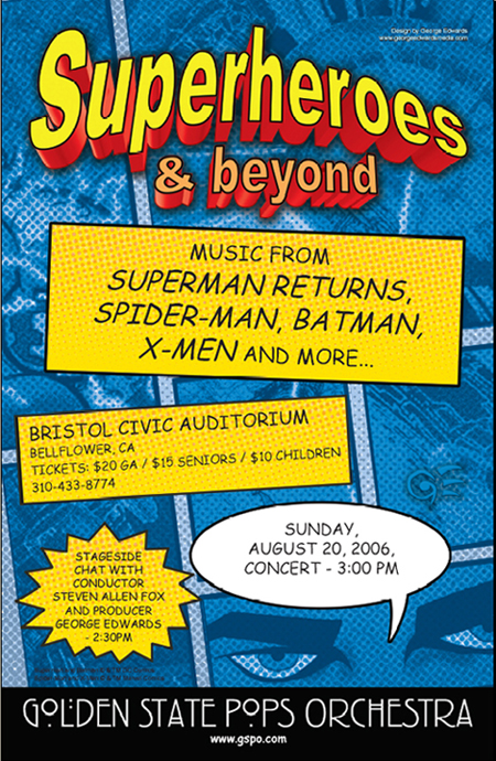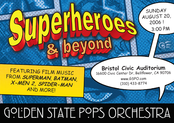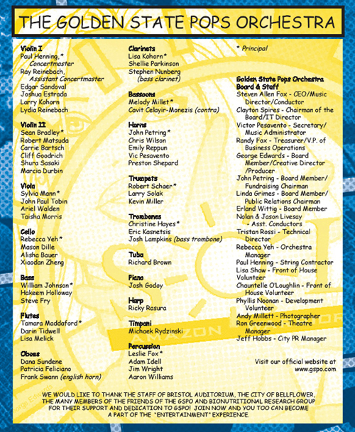 The Golden State Pops Orchestra (GSPO) (www.gspo.com) performed its movie music symphony concert at the Bristol Civic Auditorium in Bellflower, CA. The show was a great success, and was a unique experience for audiences. Not only did they experience movie music from Superman, Batman, Spider-Man, X-Men, but they also witnessed the world premiere of music from BattleWorlds.