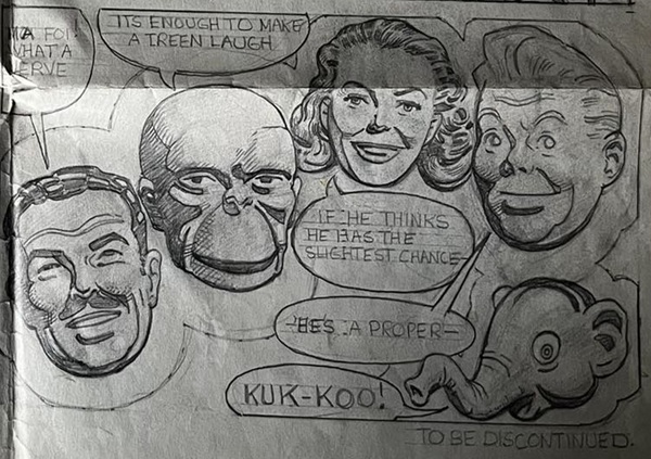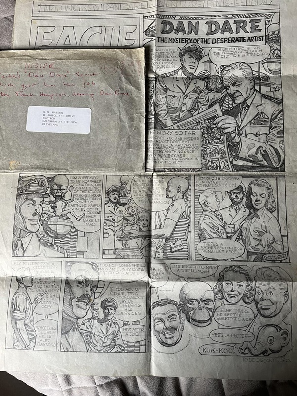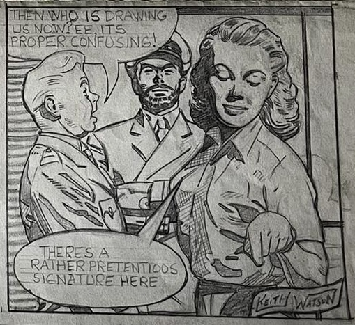 Artist Keith Watson is probably best known for his work on the last few years of the Dan Dare strip in Eagle in the 60s. His first work on the strip had come in 1958 in the latter days of the Frank Hampson studio. Thanks to Monica Priest, the daughter of the former partner of Watson's brother Norman, we can now enjoy his light-hearted pitch to join Hampson's team.