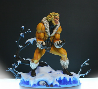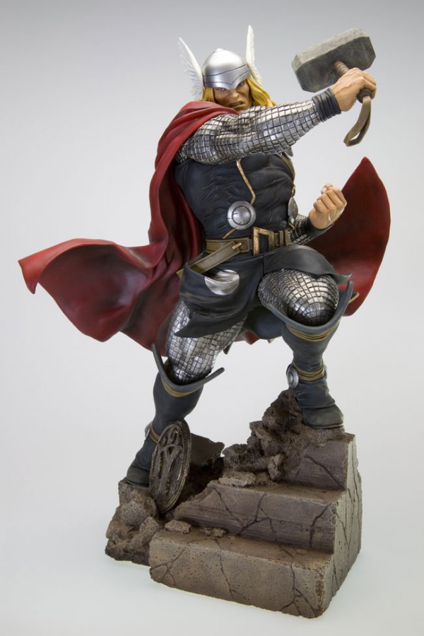 They actually made the sleeves look like plates instead of little puffy quilted squares.•• Unfortunately, that serves to point up the absurdity of the "skin tight" aspect. Unless we are being asked to believe Thor's sleeves and leggings are CONTOURED to the shape of his muscles! There are a lot of odd design choices in that costume/armor, really. The circles on the front of the body become three dimensional "shields", which has become something of a habit when sculpting Thor -- except below his belt they are merely silver circles (as they properly should be in all six instances, imho). Why the change? And why does that rippling version on his right side look like it would not turn into a circle if laid flat? Then there's the strap across his chest. What's that for? If it holds his cape across his right shoulder, what holds it on the left? And if something ELSE is holding it on the left, what's it for on the right? All in all, this smacks of the same kind of design-think that has infected STAR TREK. The more recent versions have had MORE bells and whistles. Everything is much more complex. As if technology got knocked back a couple of centuries after TOS. So too with Thor. Why does THIS Thor look so much more "primitive" than the traditional Marvel version?