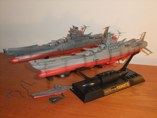 In the foreground is the new "Soul of Chogokin" Space Battleship Yamato display toy, with the 2001 "Soul of Popynica" version in the back, and the Bandai 4 inch long mini-model for scale (and the SoP's rocket anchor chain). The camera flash really washes out the paint job, so the weathering looks a bit more obvious than normal. The SoC Yamato is longer than it's predecessor and comes with more digital bells & whistles (light & sound effects, plays the theme music via a remote), but seems a lot more fragile than the Popynica one. And despite it's Chogokin name, it's mostly constructed out of plastic than diecast metal (a far cry from Aoshima's "Shin Seiki Gohkin" line of replicas). Having a lot of fun now firing the Wave Motion Gun.