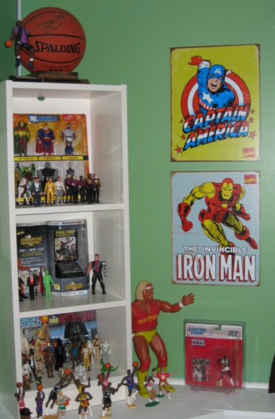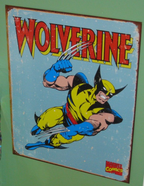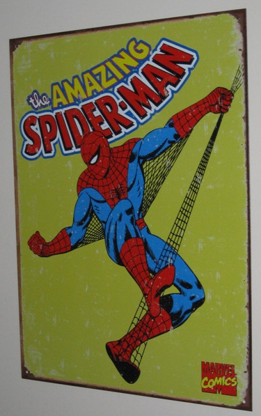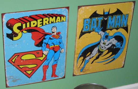 There was a store at a mall selling a bunch of retro looking stuff including tin signs of all sorts.  Some of them came from there, the others from online stores.  Just do a google search for "superhero tin signs" or something and you'll find them.