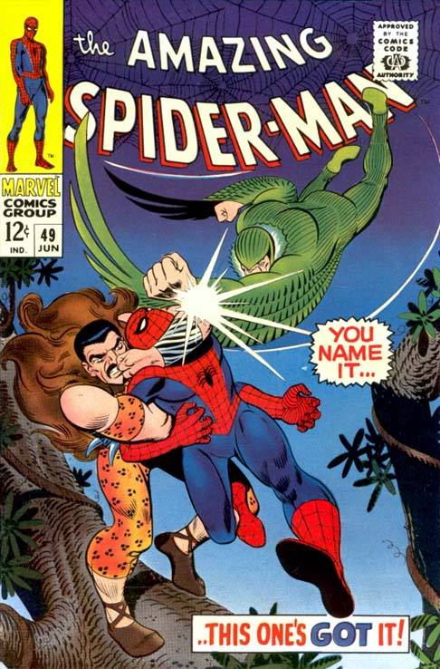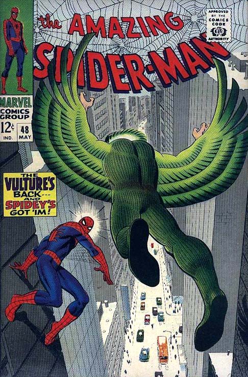 One of the cool things for me about the Vulture was seeing this old sickly looking man giving Spider-Man a good licking.•• Not sure whose version of the Vulture you guys are looking at! Ditko's original model was bald and ugly, but he was far from "sickly".