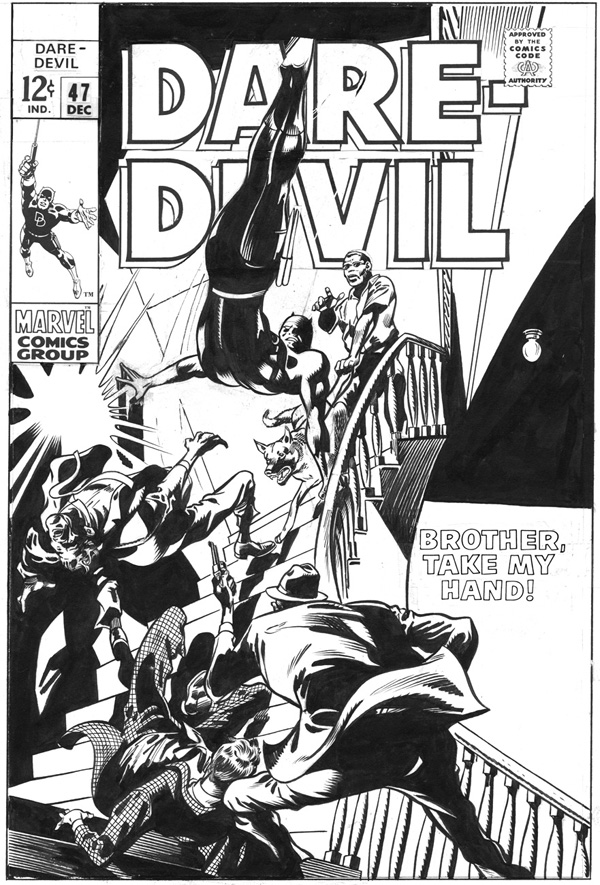I read Daredevil #47 "Brother, Take My Hand!" for the first time in Son of Origins when I was about 7 years old. I really loved that story when I was a kid, DD wasn't fighting any super villain but it really stuck with me thru the years. It is one of my favorite stories, been looking for the interiors but none have ever surfaced so I am thrilled to own the cover. It is different than the published cover, the logo was made large and stated so DD's feet had to be painted over. At some time the stat was removed and here you see the original art. This is very fortuitous as Stan 'the man" Lee will be at my LCS in October so I will get him to sign it before it gets framed and will be hung in my den.