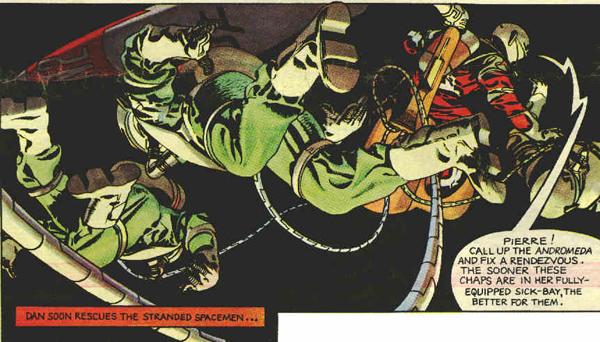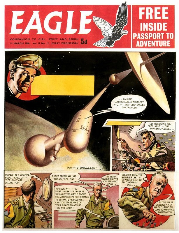 "SPA-1", by the way, is the acronym for "Space Platform Astronomy - 1".As the story opens, the new superfast prototype spaceship, Nimbus 1 has gone missing somewhere out near the orbit of Jupiter, and Space Fleet (note their crest on Dan's cap) has called in SPA-1 to scan for any trace of it. The next installment contains one of the most chilling scenes I'd ever read in comic format, as Dan Dare and his "batman" Digby arrive at SPA-1 to check on the progress. The big dish cannot find any trace of Nimbus 1, tho at one point it does pick up a small clump of fuzzy images. At first, the station controller thinks these might be debris, but he decides they are too "soft" for metal. They're just ten rather fuzzy blobs. "Good grief," says Dare, "did you say ten?" He and Dig race off, leaving the station controller somewhat flustered. "Whatever made them rush off like that?" "I think I know," says the guy running the scan. "There are precisely ten of those blips, and by a very nasty coincidence, the number of the crew on Nimbus 1 was... TEN!" TO BE CONTINUED!!