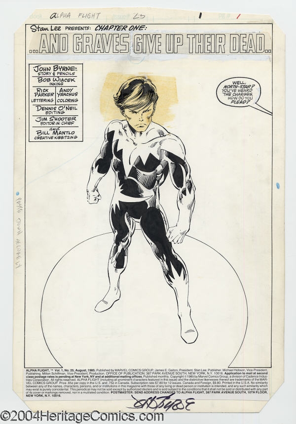 That yellow smear across Northstar's head is not an example of "seeing the work". More an indication of the extremes to which Shooter would sometimes go to exercise his whim of iron. He declared that Northstar's head was too big on that page, and ordered a reduced stat be shot and PASTED ONTO THE ORIGINAL ART. Apparently, over the years, someone disagreed, and peeled off the stat. But that leaves us with the yellowed glue, so the piece is defaced -- no pun intended -- either way.