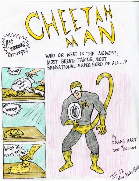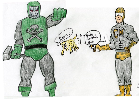 These were my sketches of Cheetah Man and his arch nemesis Death Smash created by my (then) 6 year old nephew. Inspired by what Ethan Nicolle has done with his younger brother and AXE COP I've been working on a comicbook with my nephew for the last month or so (I've been watching him for about 3-4 hours a day so it has given us time to collaborate!). It's been a ton of fun and I thought I would share it here!
