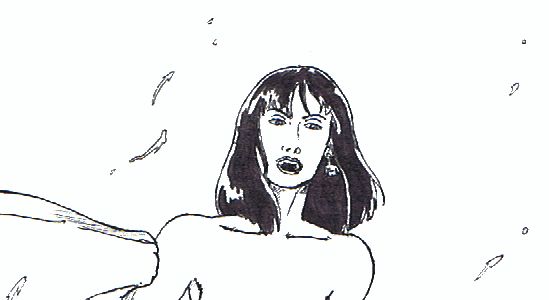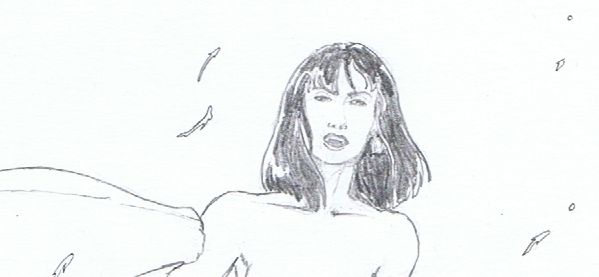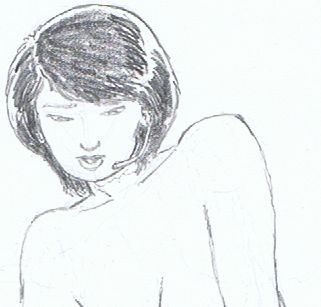 I was trying to come up with a more complex pose for this one (propped up on one elbow, gazing down at an "iPad" device on the matress in front of her), when I looked again after I went over her head with bolder strokes...