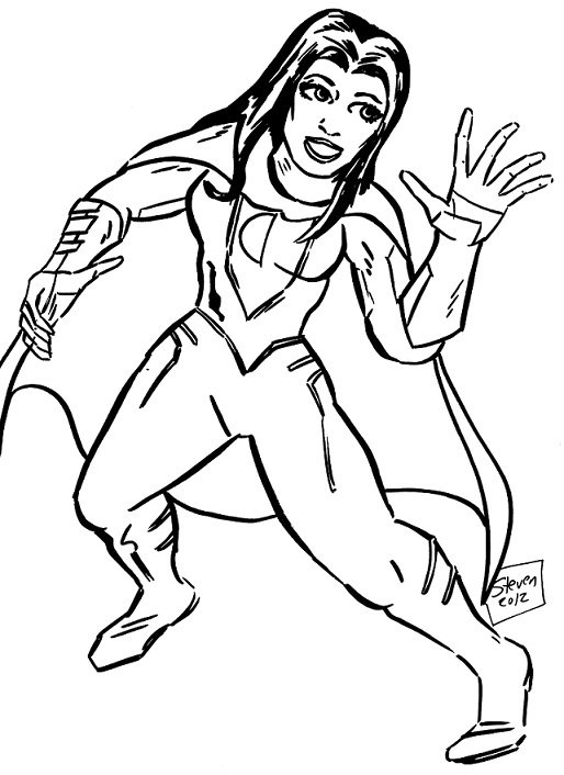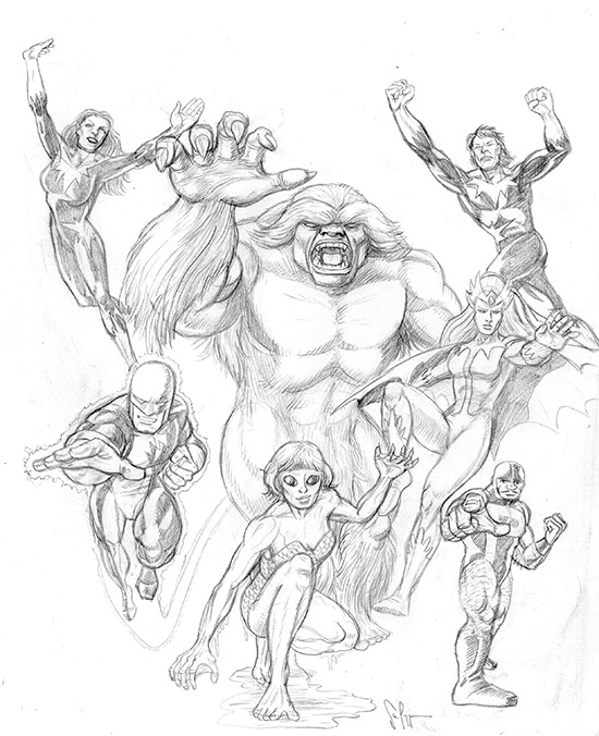 One of my latest projects involves coming up with a series of model sheets for characters to be featured in an story concept that I've been planning.  At this stage, I simply make the "nude outline" of characters that I'll then flesh out and design their costumes over.  In this case, it's a very rough pencil sketch using light pressure on the soft B graphite to put down the outlines that will be cleaned up after I finish the heavier permanent lines and inking.