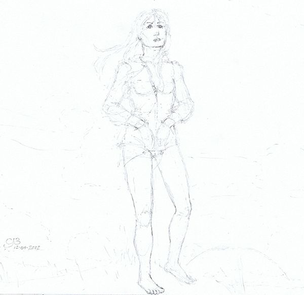 The original pencil scan would've been too light for some to see here, so I darkened it just a bit using the histogram adjustment tool in the paintshop program.  The final form of the piece will be a printout of the inked linework that gets colored using the new set of markers that I brought this past weekend.