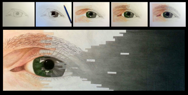 This is my first post in this thread. This is a compilation of the different stages of a piece I've titled "Blind Sighted". It's done wth pencils and it's a semi-auto biographical representative design based on myself and having lost the vision in my left eye 8 years ago (if you've ever notice my avatar, there is a hole where my left eye would be, even though I still have my left eye in real life).