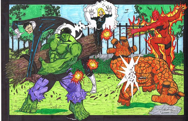 Sebastian, I see so much improvement every piece you create. The Torch is easily the best, most majestic, powerful figure I've seen you draw. Reed is not the focal point, but, once I picked him out, he was perfect for the part he portrays in the work. Ben is well developed into the fall guy, while the Hulk is the one who looks like you might need finding. Sue,.....Sue is tough. I won't tackle her yet. She's such a boyhood crush.