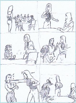 Quick six-panel comicbook page layout. I've seen examples from discussions elsewhere about recent trends in comicbook storytelling techniques where something is missing in certain scenes. Looking at the conversation settings, I recall a page or two of rather static head shots with minimal reactions from the characters being portrayed. Hence, I go back to lessons learned from my reading of How To Draw Comics The Marvel Way, and seeing examples of how it got done by masters of the craft.