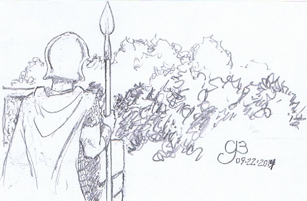 The historical subjects made an itch that I had to scratch again this weekend. Roman soldier overlooking a wall facing into the wilderness, wondering how he's supposed to spot the barbarian hordes roaming the forest beyond. Kind of inspired by the cover to that Wishbone Ash album Argus.