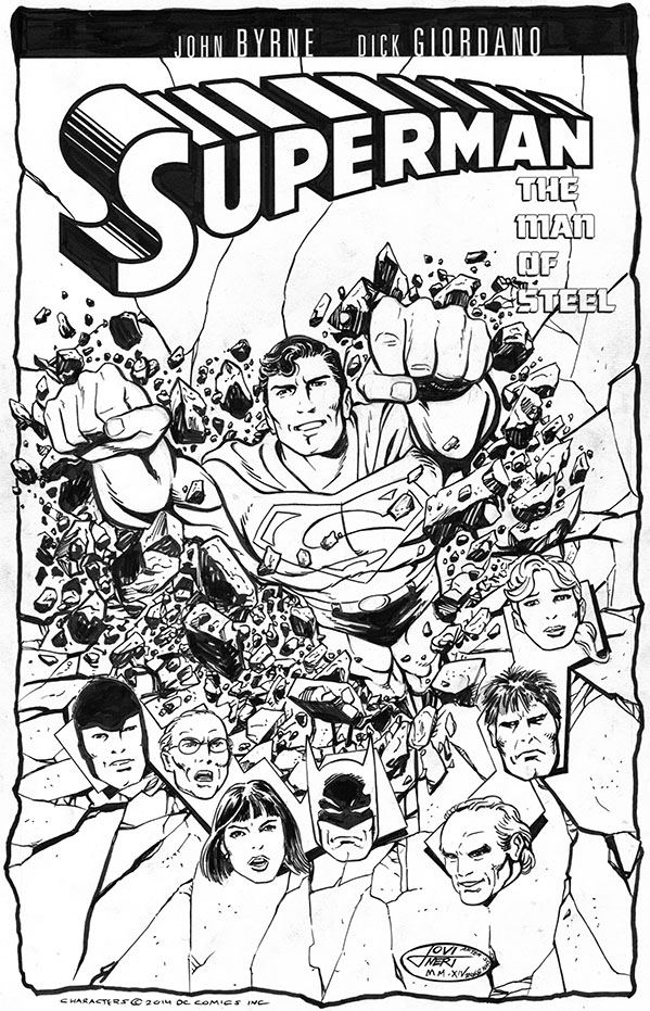 Jerry Ordway drew the cover to Superman Man Of Steel TPB Vol.1 even if nothing inside contains his art. I own 3 of his covers (vols,3,4,6) but was not interested in 1 because he didn't draw the interiors. I imagined: What if JB drew it? I used JB's West Coast Avengers 51 cover as the layout to this imaginary cover, and changed the faces trying to "ape" JB's style - even down to the way the margins are lined up (I should know as I am proud owner of 2 JB commissions!). Here is what I drew: