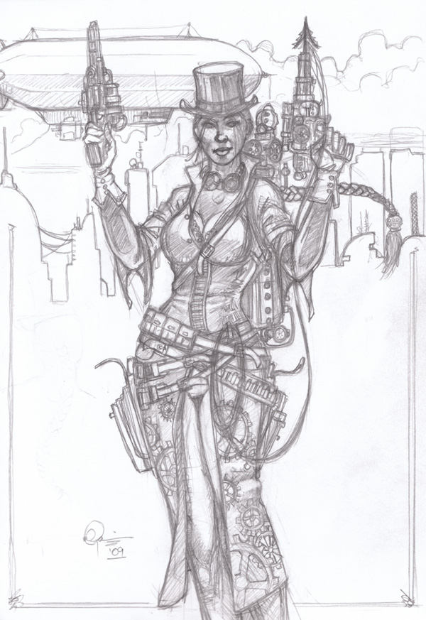 Pencils for a steampunk-themed challenge - the composition sucks, though, so I'll redraw her with actual feet actually in shot before I ink her. Was happy with the first effort, though, drawn in my book while on the couch watching football...