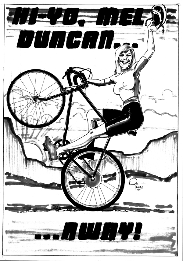 Great work as usual from everyone - Darren, especially loooove your colour stuff. It's inspirational. Here's one I knocked out as a farewell gift for one of the girls at work - she's an amateur competition cyclist, and the folks wanted one of her riding off into the sunset (excuse the low-res scan, it plays merry hell with the greys)...