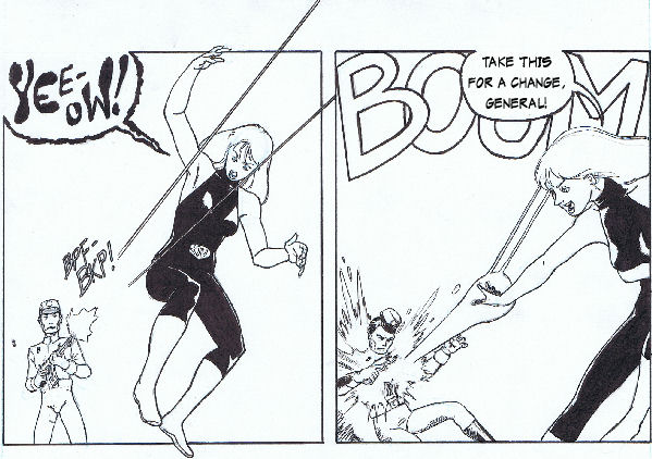 The sequence of the action would gone like this: PAGE ONE Kid Fury takes on Panzer and has him on the ropes, until his partner Aqua intervenes and hydrokinetically slams a poolfull of water on her. PAGE TWO As Kid Fury starts to drown, Panzer is gloating but something smashes through the ball of water entrapping her and splatters it, getting Panzer wet and stunning Aqua, whose concentration on maintaining the water prison was broken. KF opens her eyes and finds herself in the arms of her teammate, Sidewinder. PAGE THREE The other villains, Mindbender and Concentric Man, have Mandragore and Powerhouse on the ropes with a double-team psionic attack when Kinetik and Shakti arrive on the scene. Mindbender turns his attention to the heroines, but Shakti puts herself between him and the others, taking the brunt of the psi-attacks. PAGE FOUR When he doesn't see Shakti buckling under his psi-blasts, Mindbender ramps it up but that proves his undoing, as she is able to absorb all of the energy from his attacks and converts it into a blast of tiny biokinetic bubbles which pushes him into his partner Concentric Man with enough force to knock them both out.
