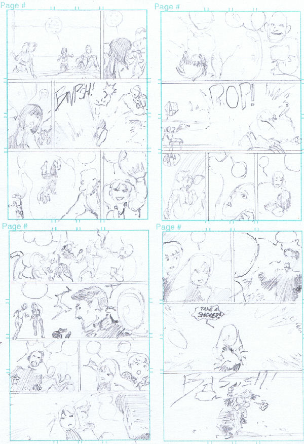And, finally, a 4-page thumbnail series of what would've been a big fight scene in one of my comicbooks.