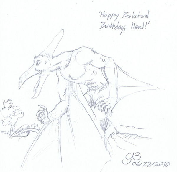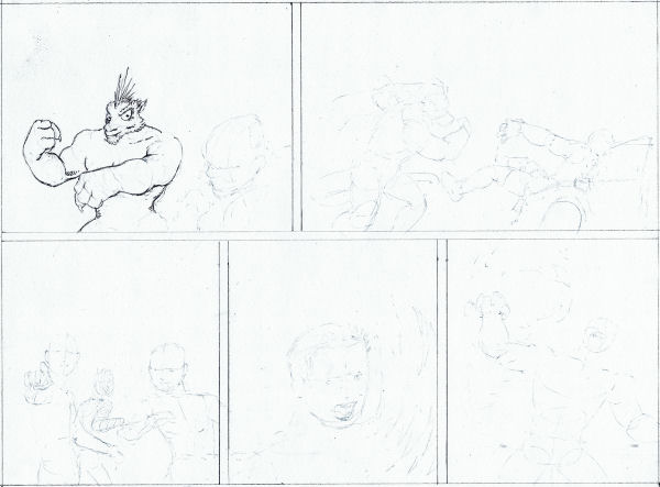 This one's a little bit of a "false start" for me. Hence, the partially laid out panels in this page. I was trying to get something started just to have something to put through the big scanner that I recently brought, only to find myself going "Crap! I can't get it right," again. Basically, it'd be a fight scene with some original characters of mine going up against each other. The layouts, of course, were done in blue pencil (darkened in Paint Shop Pro 9 using the histogram adjustment tool). I had started filling in the protagonist on the first panel using 2H graphite, but I was in the middle of doing something with my laptop at the time and couldn't take it off the desktop to really get the drawing board in use.* I'll probably bring this one back out after a while to see if I can't get it finished. * Try finishing a pencil sketch while cradling a drawing board in your elbow while also glancing up at a laptop screen to see if the computer startup has finished running. Kind'a hard, isn't it?