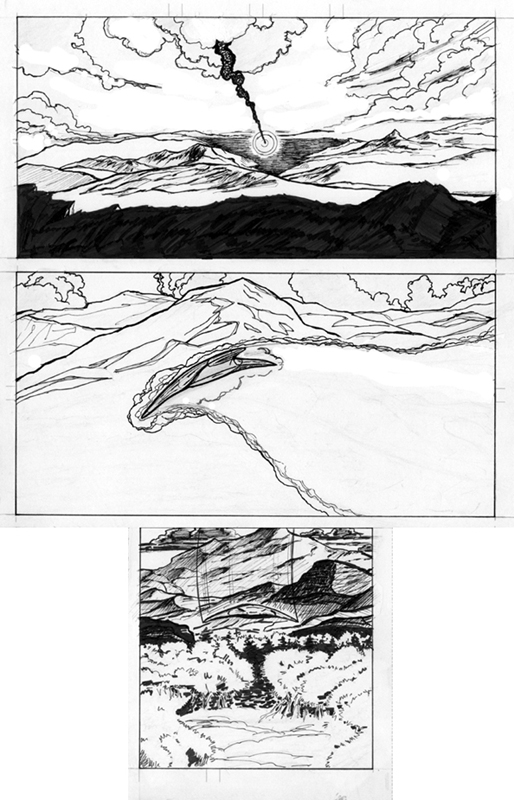 I haven't posted in a very long time either so here are a few in progress panels that I don't completely hate - just messing around with a spaceship flying around a landscape for the fun of it - I suck at inking and I'm not sure how to handle the clouds with ink\