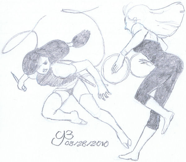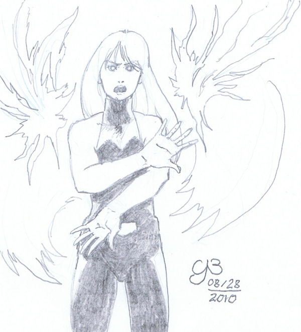 I gave a couple of my original characters a little bit of "air time", trying for something more substantial than the general "pose for the picture" sketches that I was usually doing.  First one was Shakti (my name for her, for now) throwing up a force field deflecting fireblasts from an unseen opponent; second is her landing and confronting Obsidian Joy, an alien adventuress/crimefighter who has adopted a costumed identity ala Batman.