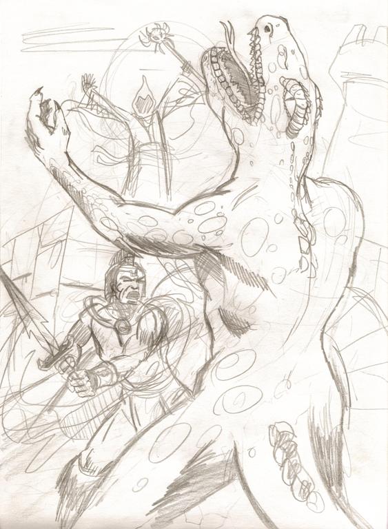 One of the reasons that I used Bristol board, Joe. Although you could still get smudges on that, if you were a bit heavy on the pencils and tried erasing too soon after putting the ink down, it was easier to remove excess pencil lines without worrying about pulling along some of the ink with the eraser. Of course, the current technique that I'm using is to just use a real light blue pencil to lay out the picture before filling in the line art with a standard (2H or HB) graphite pencil. After inking, I TWAIN scan the image within a photo-editing program (I use Jasc Paint Shop Pro) and remove the pencil lines using the color replacement brush. It's as simple as selecting the pixel representing the pencil mark scanned, and replacing it with the pixels representing the blank page.