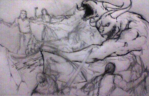Recent work from today...doing some RPG stuff...standard adventurers going up against a pair of Minotaurs!