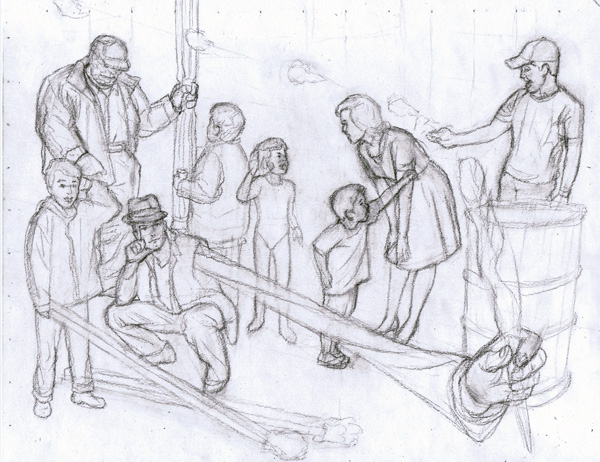 Here are the initial pencils, establishing the composition and blocking in all the characters: