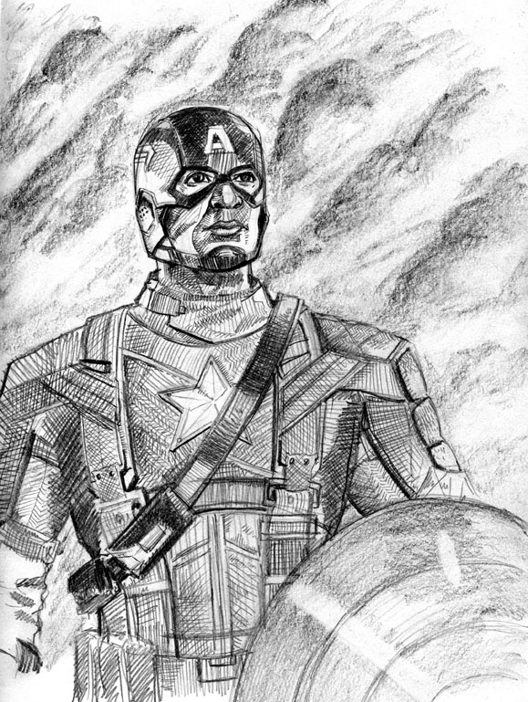 I'm thinking of doing a Chris Evans Captain America for my next practice painting with Painter.  I've been doing some pencil sketches first. The movie costume is a pain to draw though.  So many straps