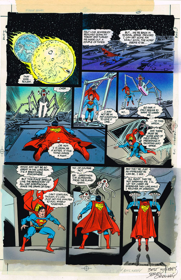 And he's a color guide by Bill Wray from Superman The Earth Stealers - which was written by JB, penciled by Curt Swan, and inked by Jerry Ordway. Bill Wray got cover credits for it. This page is relatively large for a color guide too with an image size of around 10" x 14" - while most other color guides have a paper size of 8.5" by 11". Colors were done probably with acryllic and into light bluelines of the linework. Then an acetate overlay was added. This was a gift from Jerry Ordway after I got some artwork from him: