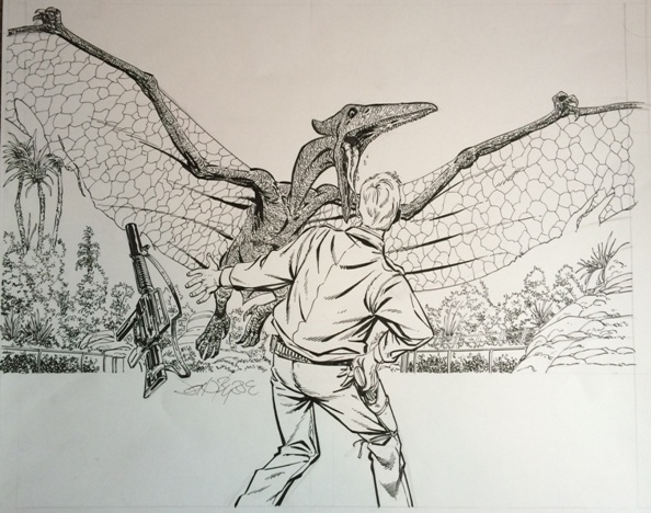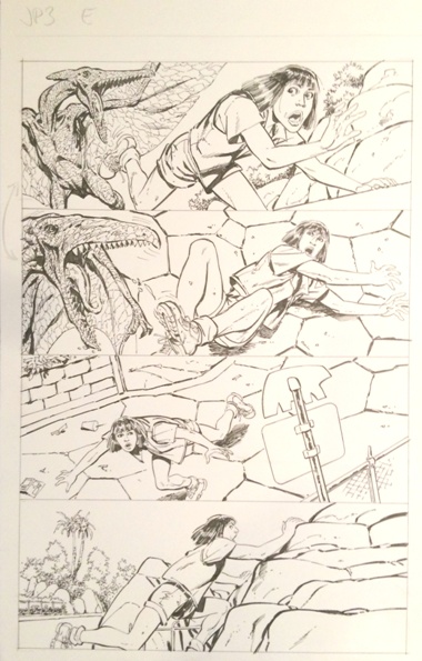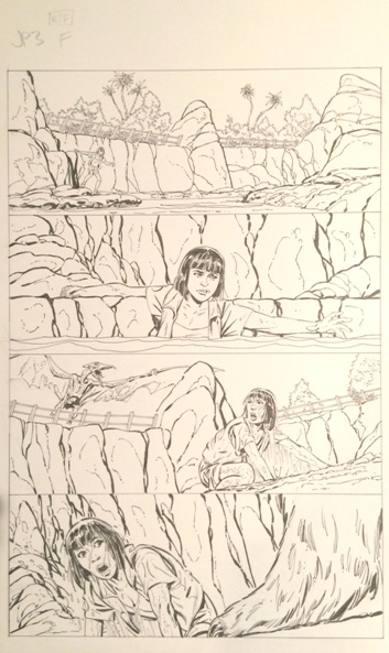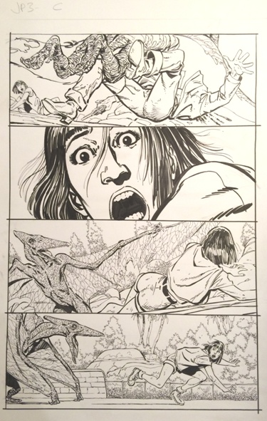 Horrible cell phone pics. Ugh. Anyway, page 14 is particularly interesting from an original art standpoint. You can see that JB decided to flip the top two panels on the published page. Page 15 is a great, cinematic moment in that final panel.