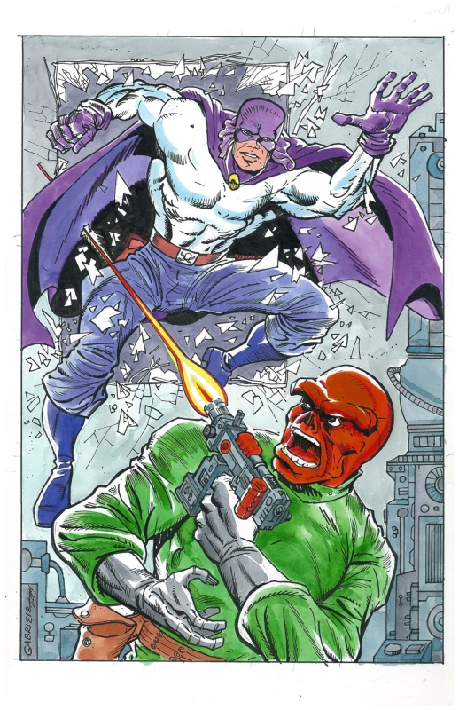 Commissioned from Angel Gabriele, this Kirby-esque piece featuring obscure public domain superhero the Grim Reaper busting in on professional jerk the Red Skull.
