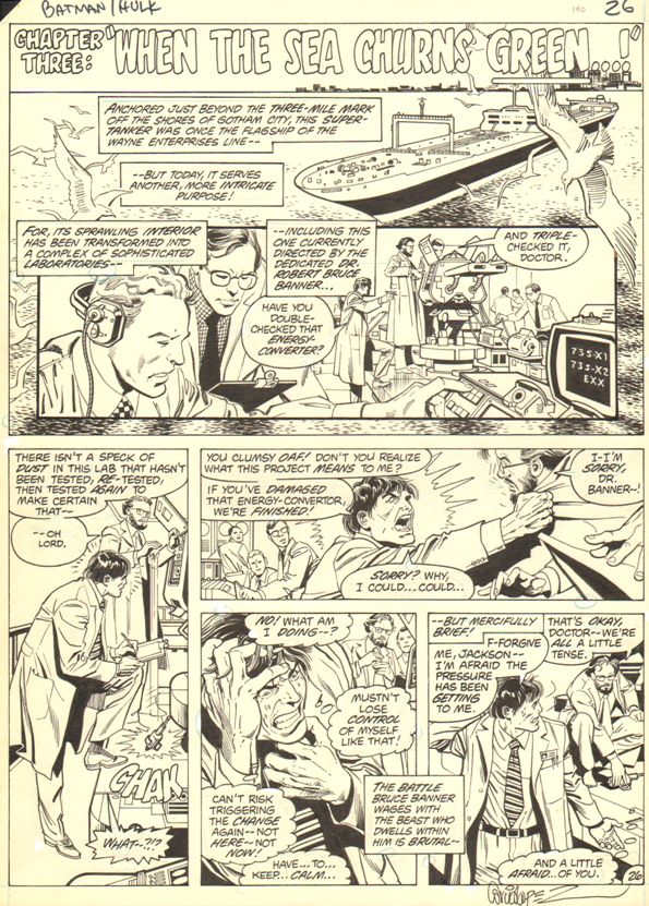 I am regularly amazed at Jose's ability to take a fairly mundane scene and put energy into it. His eye for detail is also impressive. Bruce has his foot up on a piece of machinery, in a similar stance to the one that his is holding on an earlier page in this very issue. Mannerisms, body language and weight are all captured and displayed by this artist.