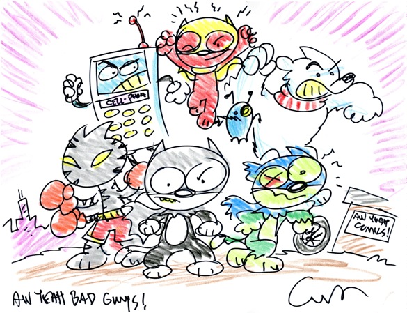 This is a group shot of the villains from his AW YEAH COMICS! book. That's Chicago and Skokie, IL in the background.