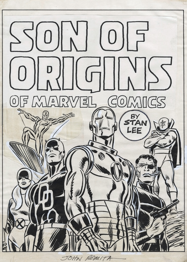 I am thrilled to have gotten the inked prelim to the Son of Origins of Marvel Comics cover by John Romita Sr (he painted the final cover). Great examples by John featuring Iron Man, Nick Fury, Daredevil, Jean Grey, Silver Surfer and the Watcher. Son of Origins of Marvel Comics contains one of my favorite comics, Daredevil #47 "Brother, Take My Hand" by Gene Colan and George Klein. I first read it in Son of Origins of Marvel Comics published in 1975.