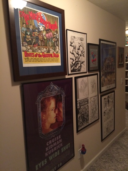 It's a narrow hallway so it was hard to get a good shot. Clockwise from top left: R. Crumb print, oversized JB She-Hulk page, Spider-Man painting by an undiscovered artist (wink, wink), Van Gogh (poster, not an original ha ha), my three "across the page" Hembeck commissions together in a poster frame, a couple of my MTU 68 themed commissions along with some smaller Man-Thing sketches, and last my EYES WIDE SHUT movie poster.