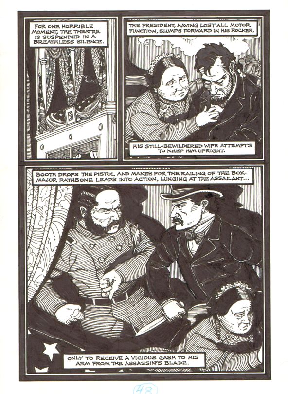 The Lincoln book is a solid read and I've recently become more curious with one of the forgotten victims of the assassination plot. Major Henry Rathbone and his wife were last minutes guests of the Lincolns that night and his life was shattered with that event. The years that followed saw his guilt, depression and PTSD-like symptoms grow into murderous rages and institutionalization. Facinating and tragic story. Geary managed to display the heroism of Rathbone to the shocking attack incredibly well in this page....