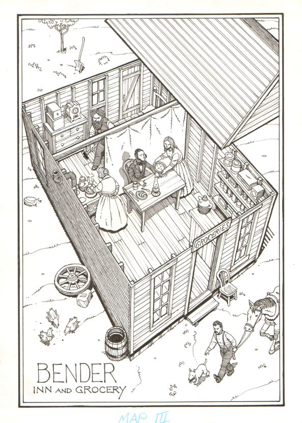 Geary has produced dozens of historical murders and mystery graphic novels. I've loved each one of them. The story of the Bloody Benders is one of my favorite volumes of his work. The story is as fascinating as it is gruesome and Geary's cartoonish style makes it even more disturbing, yet somehow more palatable at the same time. This splash page was placed at the front of the story, to depict in detail, how this family committed their crimes against unwary travelers.