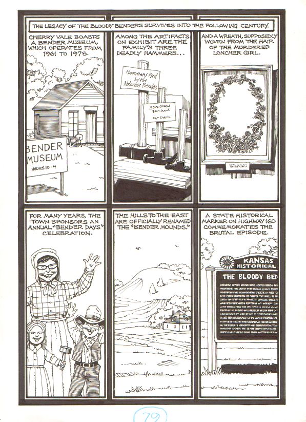 Geary not only provides great detail about the horrific crimes the he depicts in his historical murder graphic novels, but he clearly lies out the prominent theories behind these crimes and those who may have been involved. In the Bloody Benders book, he goes a step farther and discusses how the local community exploited the crimes for profit and celebration in the years since the murders took place. A commentary on our society to be sure..... and a very powerful page.