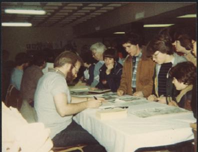 Hello everyone - Long time lurker and huge JB fan, and first time posting in a long while. Just came across a JB piece from 1982 Mid-Ohio-Con that I'm finally going to have framed and thought you all might like to see it. My brother and I must have stood around and watched JB draw for an hour or so before my Mom pulled us away. I got the Batman and my brother got a Beast. Anyway, here's us watching JB in action: