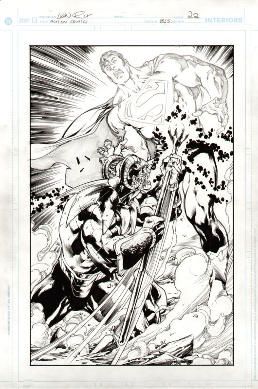 I just picked this up Ivan REis Action 815 page 22. They actually cut this page digitally and put a different Superman in the printed page. But this one looks so much better. I like that it is only half inked. I imagine that Gog is Ripping him out of the printed page. :-)