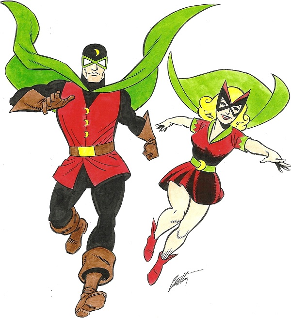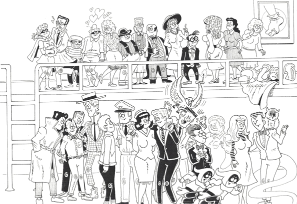 The latest and last addition to my JSA (40s-80s) vs. Spider-Man villains (#1-50) series, a "cast afterparty" featuring various and sundry supporting cast members from the individual Justice Society member's series and the Ditko Spider-Man run. (Hence the non-Romita Gwen and obscured MJ.) Please allow me an indulgence and forgive the block of text that follows. For those who came in late, the rest of the pieces in the series (page/post #): 105/22 - Johnny Thunder/Thunderbolt vs. Xandu and the Beetle by Robert Pope 107/12 - Power Girl vs. John Jameson and Rhino by Adam Smith 107/14 - "cover" by Dan Avenell 110/15 - Star-Spangled Kid vs. Shocker by Dick Ayers 110/16 - Starman vs. Looter/Meteor Man by Ramona Fradon 110/17 - Red Tornado vs. Vulture II by Keith Pollard 110/18 - Huntress and Robin vs. Kingpin by Dick Giordano 122/20 - Green Lantern vs. Crime-Master, Tinkerer, Spider-Slayer and the Living Brain by JB 122/21 - Hourman vs. the Lizard by Geoff Isherwood 125/7 - Red Tornado, Wildcat and Mr. Terrific vs. Big Man and the Enforcers by Fred Hembeck (apparently the Big Man discretely withdrew while his men were getting pummeled) 125/8 - The Leftovers by Fred Hembeck (featuring a key Lee/Ditko supporting cast member so she wasn't available for an appearance here) 125/9 - Spider-Man vs. some JSA villains by Fred Hembeck (technically belongs at the end "storywise," but I'm sticking with posting order) 131/23 - Atom vs. Scorpion by Ron Frenz 133/1 - Flash vs. Electro by Don Rosa 133/8 - Sandman vs. Vulture by Neil Vokes 156/23 - Spectre vs. Green Goblin and The Burglar by Bob Hall 156/24 - Dr. Mid-Nite vs. Mysterio by Frank Brunner 182/18 - Hawkman vs. JJJ and Dr. Octopus (in case you're wondering why the bird is picking on Jonah) 187/11 - Wonder Woman vs. the Sandman by Anthony Castrillo 190/16 - Black Canary vs. Kraven the Hunter by Paul Abrams 190/17 - Dr. Fate vs. Dr. Doom by Ed Hannigan and Chris Rooks 190/18 - Dr. Strange/JSA Ladies by Fred Hembeck (Wondering why Inza is a) asleep and b) wearing a Dr. Fate outfit? Go here. :-) ) 222/13 - Superman vs. the Chameleon by Leonard Kirk 339/11 - Batman vs. the Ringmaster and his Circus of Crime (later the Clown's Masters of Menace) For those who remember that far back (or inclined to explore now), hope you had (have) fun and the next time I have an idea for a 25 part commission series... Talk me out of it. Please. I'm begging you.