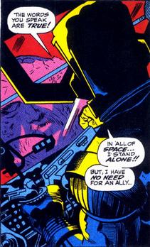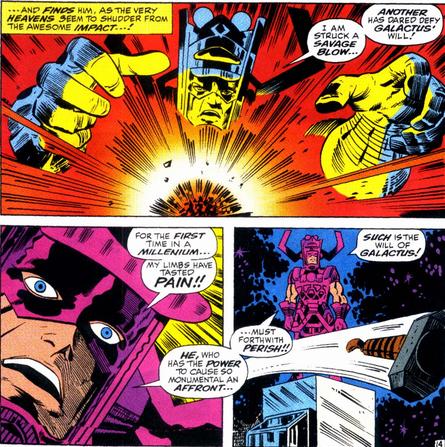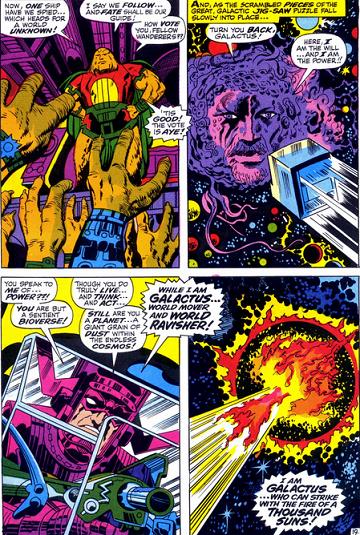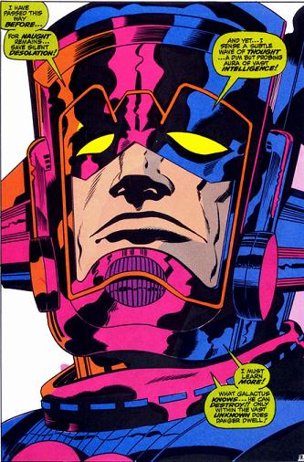Such a great character. Why, oh why, did the second FF movie screw everything up?!•• To be fair, it could have been a lot worse! I was as disappointed as anybody with the gas cloud with Galactus' shadow on it, but in many ways I suspect we should be grateful for small mercies. A CGI Galactus stomping around Manhattan -- or Tokyo, or wherever that was -- would have stood a very good chance of just looking silly. It would have taken a very deft hand to do him justice. And I will say this, altho it happened during the absurd TeleTubbie scene, I was quite jubilant when the Surfer actually said "GALACTUS". All that dancing around with "the Destroyer" made me sure they were going to cop out entirely. The real lesson here, tho, is how much contempt there is in Hollywood for comics, and superheroes. They called the SIlver Surfer by name, but had to have Ben mock the title. They snuck in "Galactus" almost as a throwaway. Yet, seriously, are those names any more silly than, say, Dumbledore, or Smeagol, or Goldfinger?