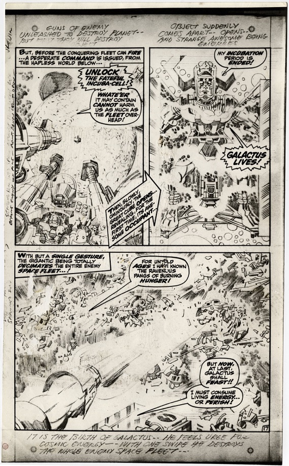 Upon reflection, distance alone would probably keep down the frequency of Galactus' feedings, making him an uncommon but deadly cosmic phenomenon, like a gamma ray burst.•• In some ways, Galactus can be compared to Doctor Who. As fictional characters, neither existed prior to their first appearance. Once they did exist, bits of backstory started to be added, sometimes without paying a whole lot of attention to what was already there! Like the Doctor, Galactus was established as having a long life before we first became aware of him. In the case of the Doctor, hundreds of years without a regeneration. In the case of Galactus, apparently able to satisfy his hunger for long periods with the consumption of a world's life energies. But once each has become part of an ongoing drama, central in the case of the Doctor, peripheral in the case of Galactus, events that were previously rare start to become commonplace. The Doctor regenerates nine or ten times in the span of only fifty years.* And Galactus starts chomping those planets on a much shorter schedule. Both, in the manner of serial fiction, depend upon a changing audience that is not keeping track of these things! _____ * When Hartnell became Troughton, it was engineered by the Time Lords, and called "rejuvenation", not "regeneration".