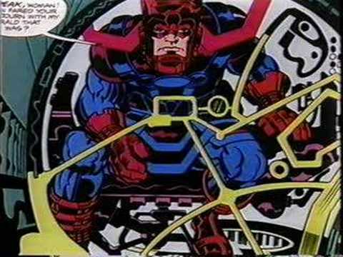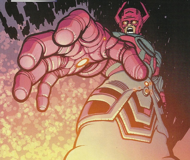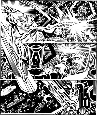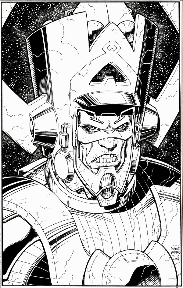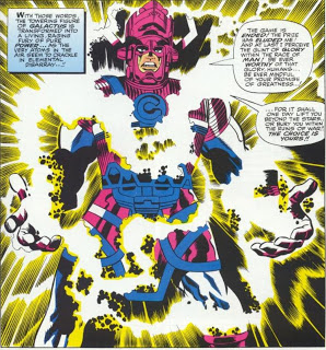 Kirby himself didn't keep it for long (he didn't keep ANYTHING for long!), but I liked the idea of Galactus having some kind of instruments in front of his eyes. A little extra something! Since then, almost everyone who has drawn the character has just given him square irises and pupils. sigh (I'm not crazy about the "cracked" armor that so many seem to be doing since Moebius, either.)